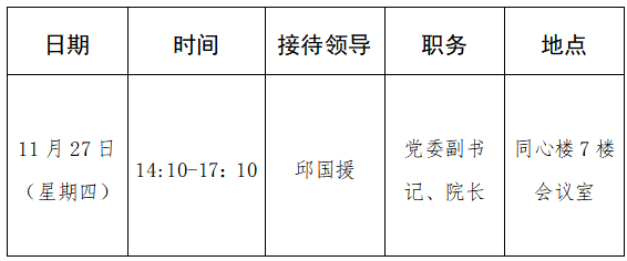 为进一步加强学院信访维稳工作,推动学院领导深入基层,切实关心广大师生员工利益诉求,帮助广大师生员工解决急、难、愁、盼问题,结合学院工作实际,现将11月领导干部接待日的安排予以公布,并就有关事项通知如下: